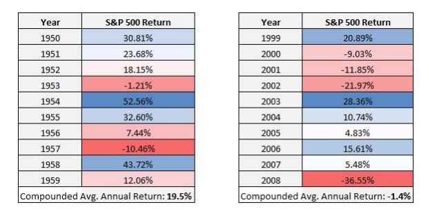 В течение лучшего десятилетнего периода (1950–1959) индекс S&P 500 принес 19,5% годовых сложных процентов. Напротив, худший десятилетний период (1999–2008) принес -1,4% годовых сложных процентов:
