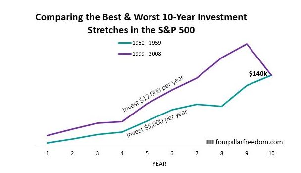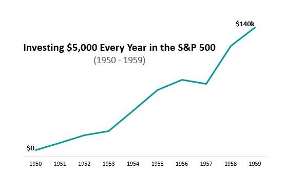 Рассмотрим человека, который инвестировал по 5000 долларов в год в S&P 500 с 1950 по 1959 год. По истечении 10 лет он накопил бы около 140 тысяч долларов: