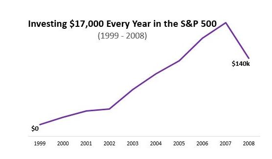 Теперь рассмотрим инвестора, которому с 1999 по 2008 год выпала худшая 10-летняя инвестиционная карта. Чтобы получить те же 140 тыс. долларов, что и предыдущему инвестору, ему пришлось бы вкладывать по 17 тыс. долларов каждый год: