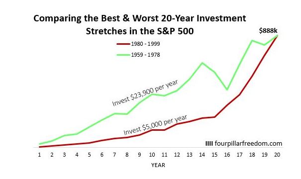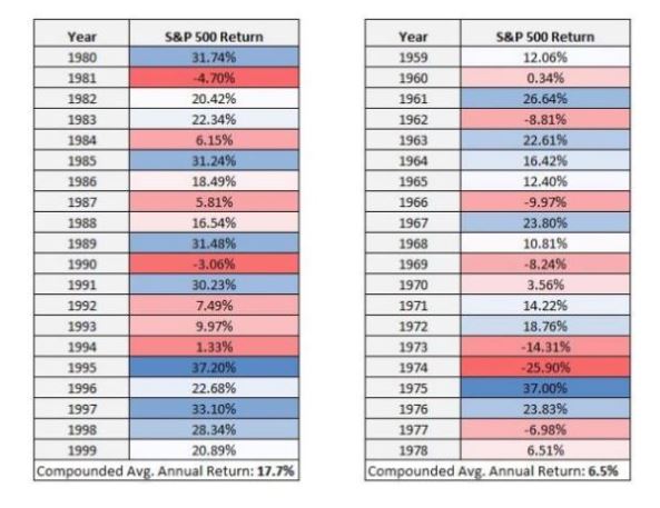 В течение лучшего 20-летнего периода с 1950 года индекс S&P 500 показал годовую доходность в размере 17,7% (1980–1999), а в течение худшего 20-летнего периода (1959–1978) — 6,5% годовой доходности:
