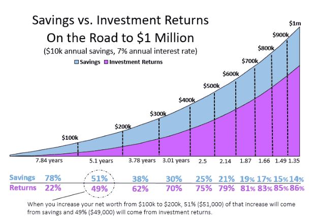 На раннем этапе большая часть вашего чистого роста капитала будет зависеть исключительно от суммы, которую вы сможете сэкономить, а не от инвестиционной прибыли . Однако со временем инвестиционная прибыль становится все более и более значимой.