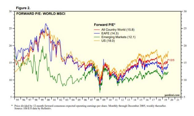 Кроме того, они, как правило, имеют более низкую оценку по сравнению с развитыми странами, как показывает следующая диаграмма от Yardeni Research :