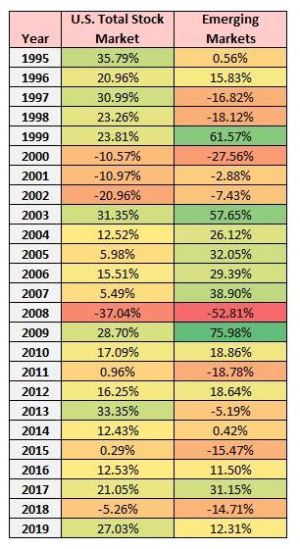 В следующей таблице показана годовая доходность акций развивающихся рынков по сравнению с акциями США с 1995 года:
