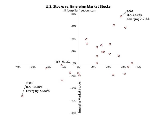 Чтобы проиллюстрировать это, взгляните на следующую диаграмму рассеяния, которая показывает доходность акций США ( ось x ) по сравнению с акциями развивающихся стран ( ось y ) за каждый год, начиная с 1995 года: