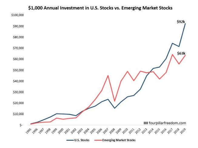 С 1995 года акции США принесли 10,0% годовых доходов, в то время как акции развивающихся рынков принесли всего 5,9% годовых доходов . На следующей диаграмме показан рост повторяющихся ежегодных инвестиций в размере 1000 долларов США в каждый индексный фонд, выполненный с 1995 года: