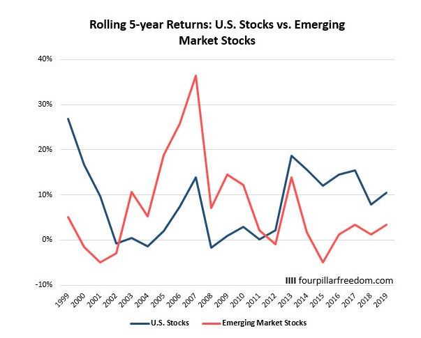 А если мы посмотрим на пятилетнюю доходность акций США и акций развивающихся рынков, то ясно увидим, что эти две компании поочередно демонстрировали превосходную динамику в течение этого периода времени: